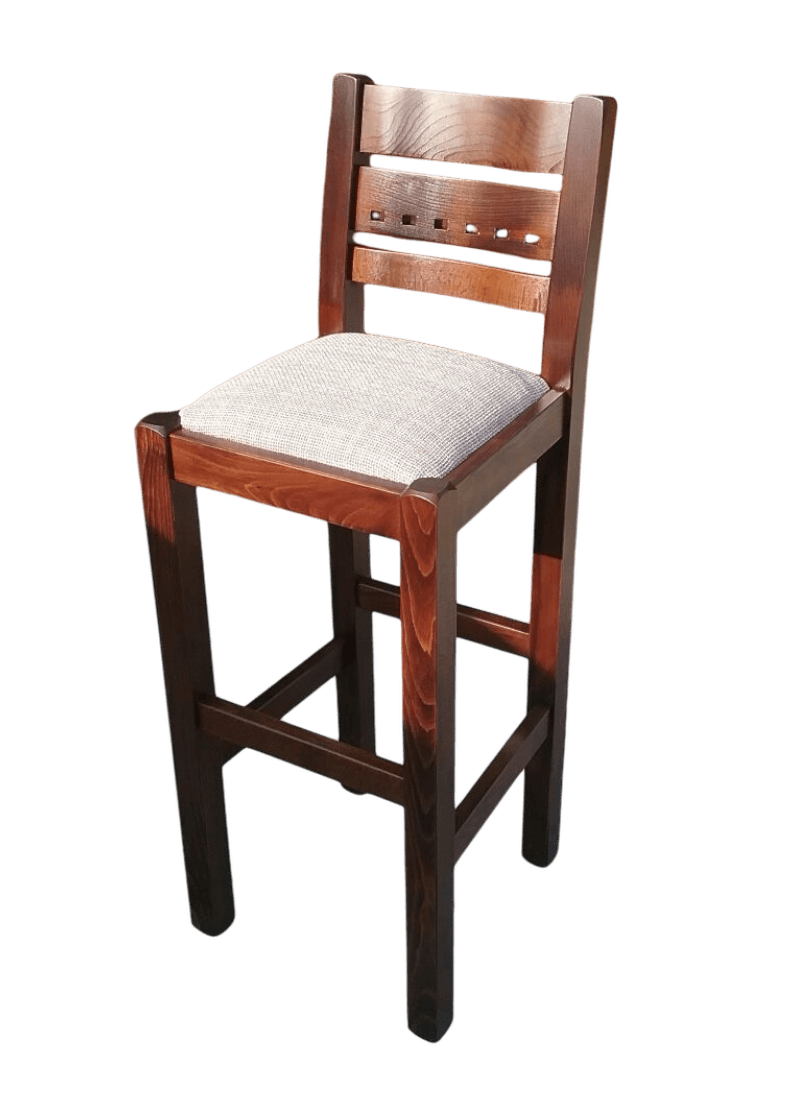 Scaunul de bar din lemn de fag în culoarea caldă a cireșului este o piesă de mobilier ce emană eleganță și rafinament. Cu o construcție solidă și durabilă, acest scaun realizat la comandă în România, îmbină frumusețea naturală a lemnului masiv cu confortul oferit de tapițeria din stofă și designul deosebit al spătarului.